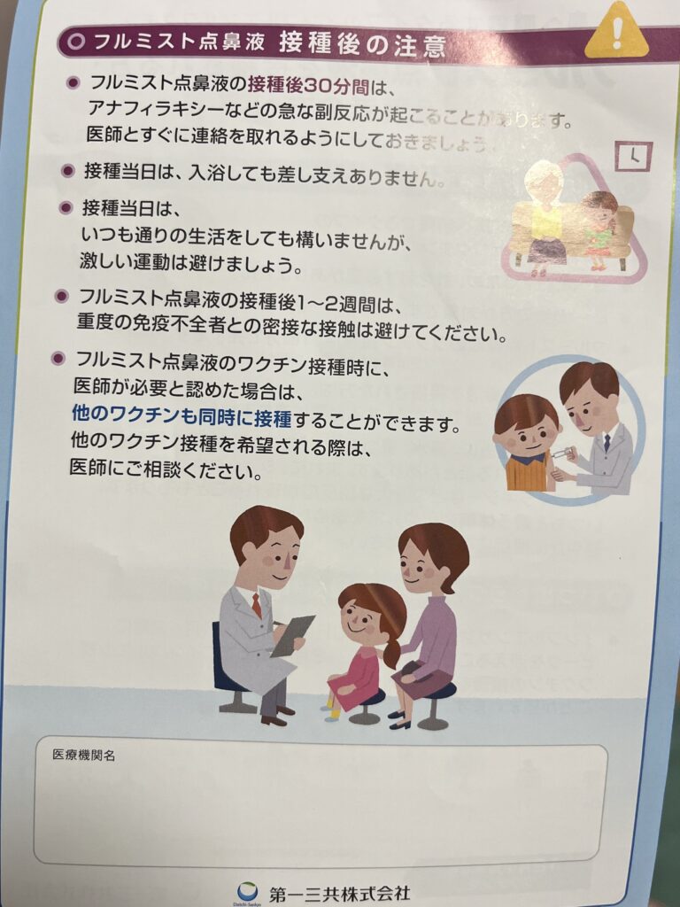 正直まだ騒がない2歳児にはもったいないなと思ってしまったのですが、1人だけ痛いのはかわいそうなので、来年からも2人ともフルミストにしようと思います。できれば大人の接種もできますように。。。